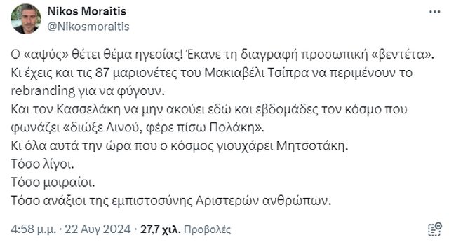 Επίθεση σε βάρος του Παύλου Πολάκη, του Αλέξη Τσίπρα αλλά και των «87» εξαπέλυσε ο στιχουργός και τακτικός συνομιλητής του Στέφανου Κασσελάκη, Νίκος Μωραΐτης, με ανάρτησή του στο «Χ», μετά την επεισοδιακή συνεδρίαση της Πολιτικής Γραμματείας του ΣΥΡΙΖΑ.