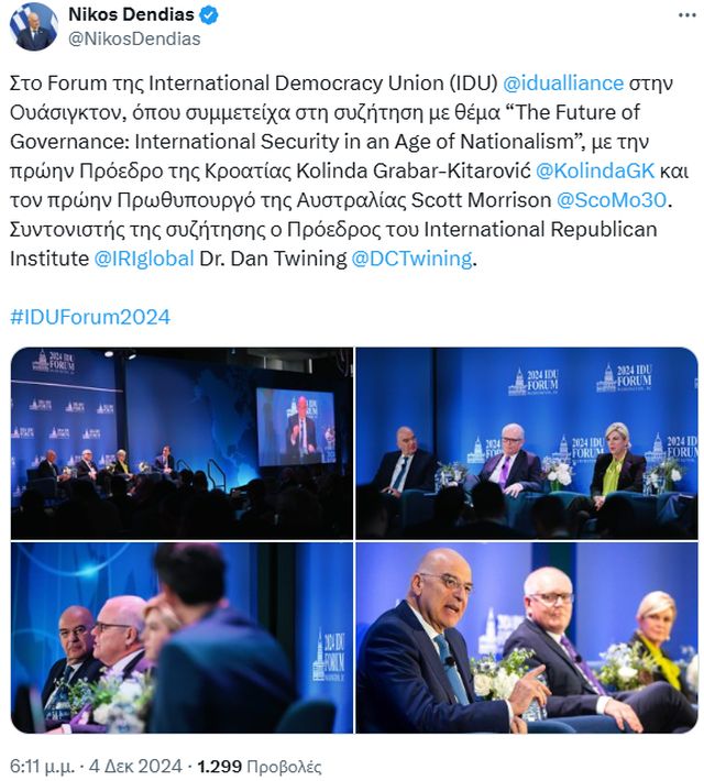 Ο Υπουργός Εθνικής Άμυνας, Νίκος Δένδιας, παρευρέθηκε την Τετάρτη 4 Δεκεμβρίου 2024, στις εργασίες του «2024 IDU Forum» το οποίο διοργανώνει η International Democracy Union (IDU) στην πρωτεύουσα των Ηνωμένων Πολιτειών Αμερικής, Ουάσιγκτον.