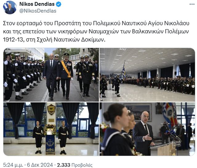 Ο Υπουργός Εθνικής Άμυνας, Νίκος Δένδιας, παρέστη την Παρασκευή 6 Δεκεμβρίου 2024, ως εκπρόσωπος του Προέδρου της Κυβέρνησης, στον επίσημο εορτασμό του Προστάτη του Πολεμικού Ναυτικού Αγίου Νικολάου και της επετείου των νικηφόρων Ναυμαχιών των Βαλκανικών Πολέμων 1912-13, στη Σχολή Ναυτικών Δοκίμων.