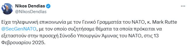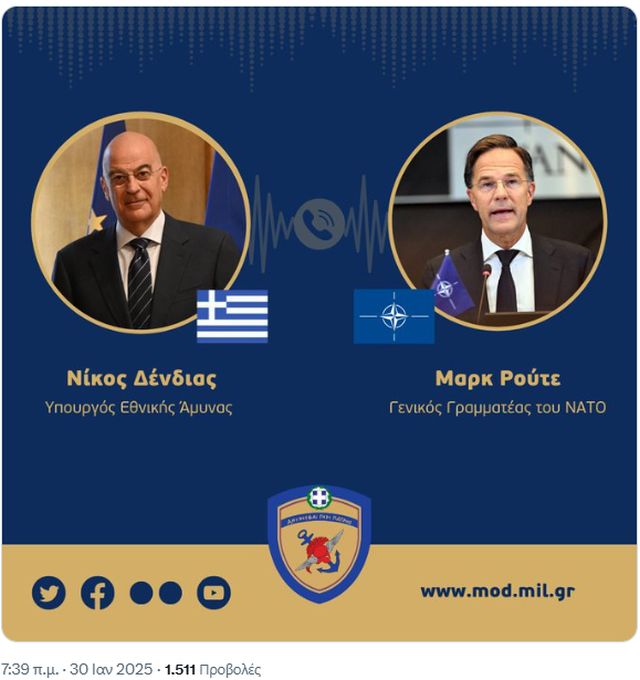 «Είχα τηλεφωνική επικοινωνία με τον Γενικό Γραμματέα του ΝΑΤΟ, κ. Mark Rutte, με τον οποίο συζητήσαμε θέματα τα οποία πρόκειται να εξεταστούν στην προσεχή Σύνοδο Υπουργών Άμυνας του ΝΑΤΟ, στις 13 Φεβρουαρίου 2025».