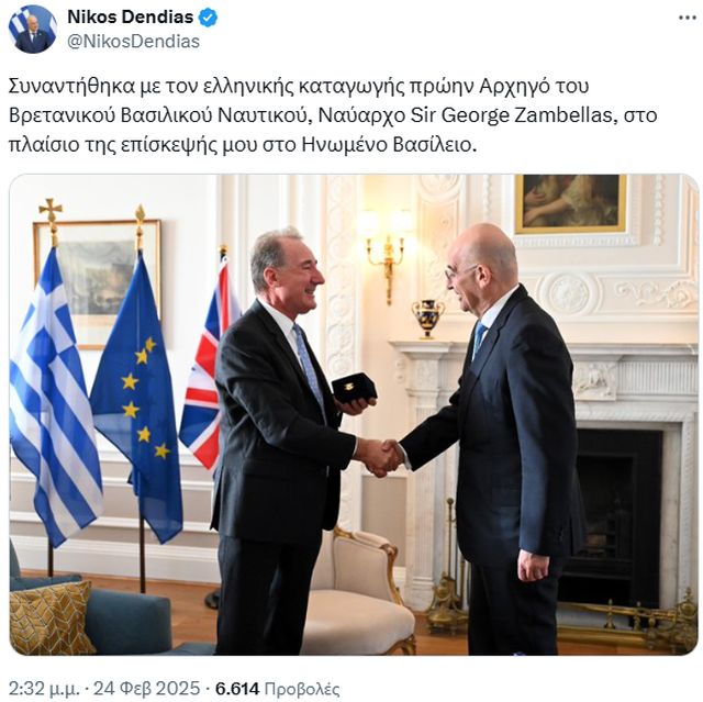 «Συναντήθηκα με τον πρώην Αρχηγό του Βρετανικού Βασιλικού Ναυτικού, Ναύαρχο Sir George Zambellas, στο πλαίσιο της επίσκεψής μου στο Ηνωμένο Βασίλειο».