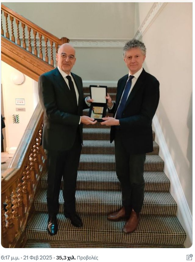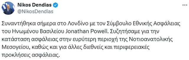Ο Νίκος Δένδιας, σε αναρτήσεις του στο «Χ», αναφέρει ότι, στο Λονδίνο, είχε συνάντηση με τον Σύμβουλο Εθνικής Ασφάλειας του Ηνωμένου Βασιλείου, Τζόναθαν Πάουελ.