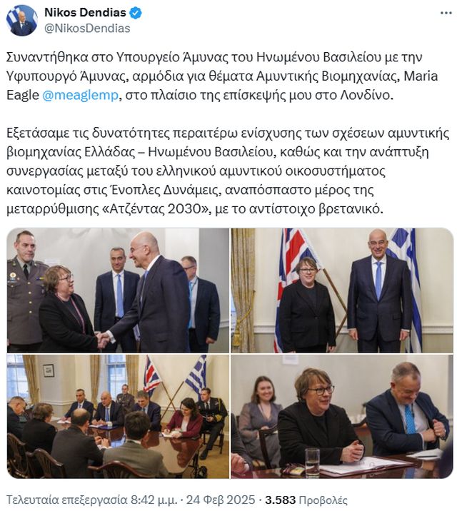 «Συναντήθηκα στο Υπουργείο Άμυνας του Ηνωμένου Βασιλείου με την Υφυπουργό Άμυνας, αρμόδια για θέματα Αμυντικής Βιομηχανίας, Maria Eagle.