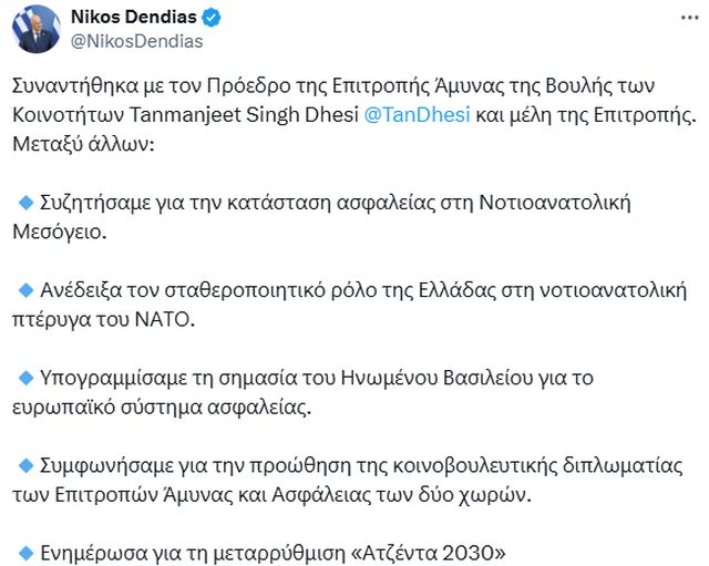 «Συναντήθηκα με τον Πρόεδρο της Επιτροπής Άμυνας της Βουλής των Κοινοτήτων, Tanmanjeet Singh Dhesi, και μέλη της Επιτροπής.