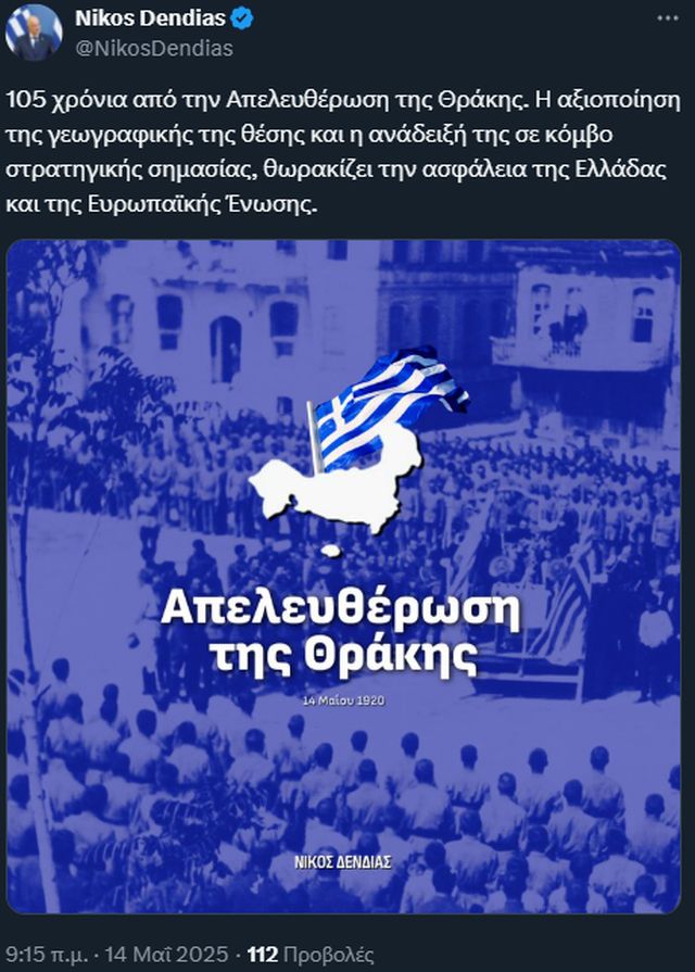 Στις 14 Μαΐου, ημέρα που τιμάται η 105η επέτειος από την Απελευθέρωση της Θράκης, ο Υπουργός Εθνικής Άμυνας, Νίκος Δένδιας, προχώρησε σε ανάρτηση στα μέσα κοινωνικής δικτύωσης, υπογραμμίζοντας τον στρατηγικό ρόλο της περιοχής.