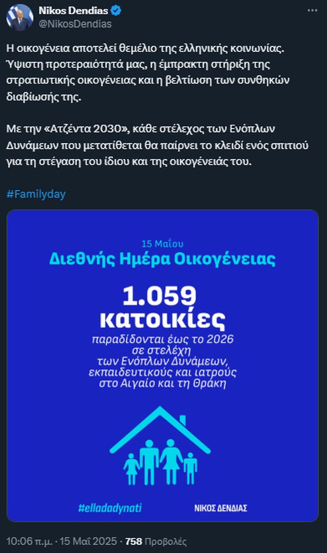 Με αφορμή τη Διεθνή Ημέρα Οικογένειας, ο υπουργός Εθνικής Άμυνας, Νίκος Δένδιας, τονίζει μέσω ανάρτησης στο «X» τη σημασία της οικογένειας ως θεμελίου της ελληνικής κοινωνίας.