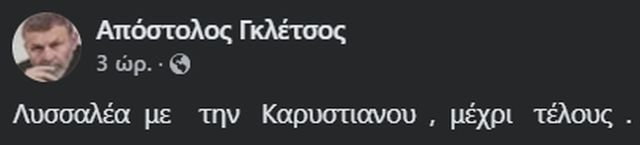 Λίγο νωρίτερα, ο Γκλέτσος, με ανάρτησή του στο Facebook, εξέφρασε την πλήρη στήριξή του στη Μαρία Καρυστιανού, διαφοροποιούμενος από την απόφαση του κόμματος να μην υιοθετήσει την πρόταση των συγγενών των θυμάτων, που ζητούν, μεταξύ άλλων, την παραπομπή του πρωθυπουργού σε προανακριτική.