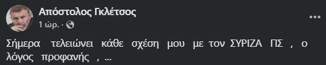 «Σήμερα τελειώνει κάθε σχέση μου με τον ΣΥΡΙΖΑ ΠΣ, ο λόγος είναι προφανής…», ανέφερε χαρακτηριστικά σε ανάρτησή του στο Facebook, λίγες ημέρες μετά το συνέδριο του κόμματος.