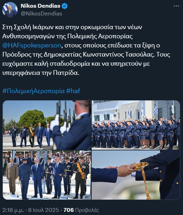 Μέσω ανάρτησης στο κοινωνικό δίκτυο «Χ», ο κ. Δένδιας τόνισε ότι τα ξίφη στους νέους αξιωματικούς «επέδωσε ο Πρόεδρος της Δημοκρατίας Κωνσταντίνος Τασούλας».