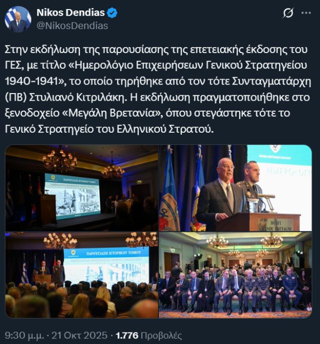 Ο υπουργός Εθνικής Άμυνας Νίκος Δένδιας, σε ανάρτηση του στο «Χ» την Τρίτη 21 Οκτωβρίου, ανέφερε ότι παρευρέθηκε στην εκδήλωση παρουσίασης της επετειακής έκδοσης του ΓΕΣ, με τίτλο «Ημερολόγιο Επιχειρήσεων Γενικού Στρατηγείου 1940-1941», το οποίο τηρήθηκε από τον τότε Συνταγματάρχη (ΠΒ) Στυλιανό Κιτριλάκη.