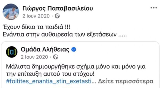 Συγκεκριμένα, σύμφωνα με τα δημοσιεύματα, ο κ. Παπαβασιλείου είχε αναρτήσει τον Νοέμβριο του 2020: