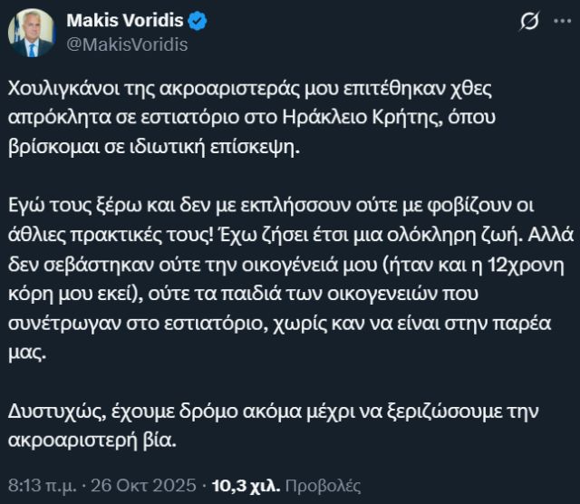«Χουλιγκάνοι της ακροαριστεράς μού επιτέθηκαν χθες απρόκλητα σε εστιατόριο στο Ηράκλειο Κρήτης, όπου βρίσκομαι σε ιδιωτική επίσκεψη.