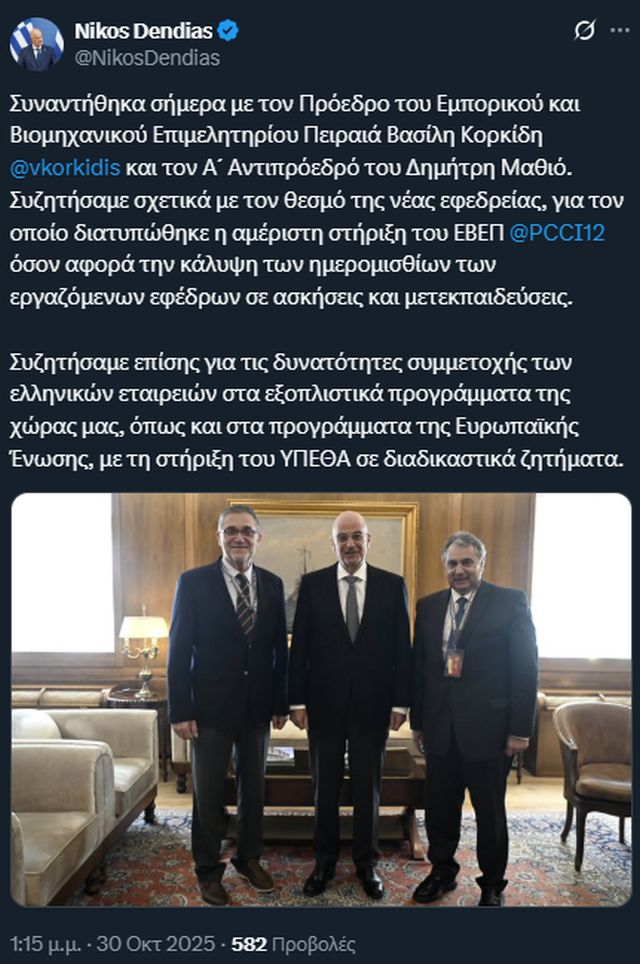 «Συναντήθηκα σήμερα με τον Πρόεδρο του Εμπορικού και Βιομηχανικού Επιμελητηρίου Πειραιά Βασίλη Κορκίδη και τον Α΄ Αντιπρόεδρό του Δημήτρη Μαθιό. Συζητήσαμε σχετικά με τον θεσμό της νέας εφεδρείας, για τον οποίο διατυπώθηκε η αμέριστη στήριξη του ΕΒΕΠ όσον αφορά την κάλυψη των ημερομισθίων των εργαζόμενων εφέδρων σε ασκήσεις και μετεκπαιδεύσεις.