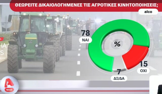 Συγκεκριμένα σύμφωνα με τη δημοσκόπηση το 78% των ερωτηθέντων συμφωνεί πως είναι δικαιολογημένες οι αγροτικές κινητοποιήσεις έναντι μόλις 15% που λέει πως δεν είναι.