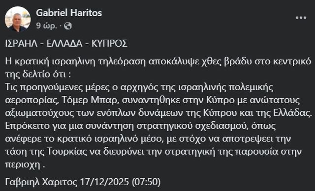 Σύμφωνα με όσα μετέδωσε ο δημοσιογράφος Γαβριήλ Χαρίτος, η κρατική ισραηλινή τηλεόραση αποκάλυψε το βράδυ της Τρίτης (16/12) μια κρίσιμη στρατιωτική συνάντηση με σαφές γεωπολιτικό πρόσημο.