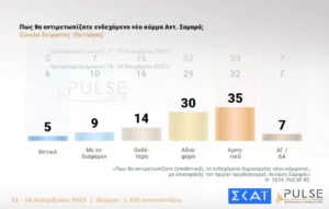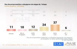 Η Pulse πραγματοποίησε νέα μεγάλη δημοσκόπηση για τον ΣΚΑΪ, με τις απαντήσεις των πολιτών να βγάζουν πρώτη τη Νέα Δημοκρατία αλλά με το χαμηλό ποσοστό του 23,5%, ενώ στο 21% μετρήθηκαν οι εν δυνάμει ψηφοφόροι του Αλέξη Τσίπρα.