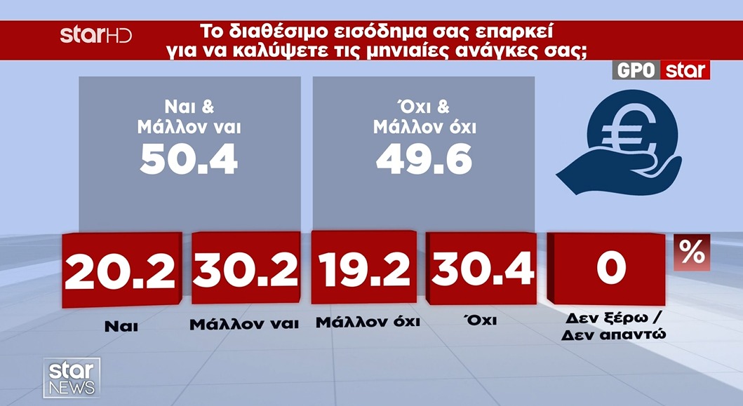 Την ίδια ώρα σχεδόν ένα στους δύο πολίτες δηλώνει ότι το διαθέσιμο εισόδημά του δεν επαρκεί για να καλύψει τις μηνιαίες ανάγκες του.