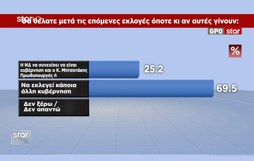Στην ερώτηση τι θα θέλατε μετά τις εκλογές, όποτε και αν γίνουν αυτές -το 25,2% θέλει να είναι κυβέρνηση η ΝΔ και ο Μητσοτάκης πρωθυπουργός και το 69,5% να εκλεγεί κάποια άλλη κυβέρνηση, πιστοποιώντας ότι το κυβερνών κόμμα έχει χάσει το λαϊκό έρεισμα.