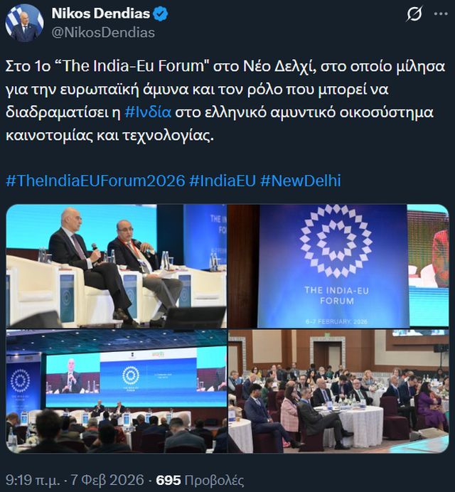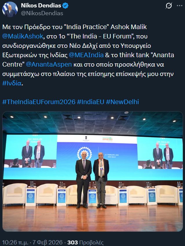 Το Σάββατο 7 Φεβρουαρίου, ο κ. Δένδιας συμμετείχε ως ομιλητής στο Φόρουμ Ινδίας-Ευρωπαϊκής Ένωσης, εστιάζοντας στις τρέχουσες διεθνείς εξελίξεις και τα ζητήματα ασφάλειας που επηρεάζουν την ευρύτερη περιοχή της Ευρασίας.