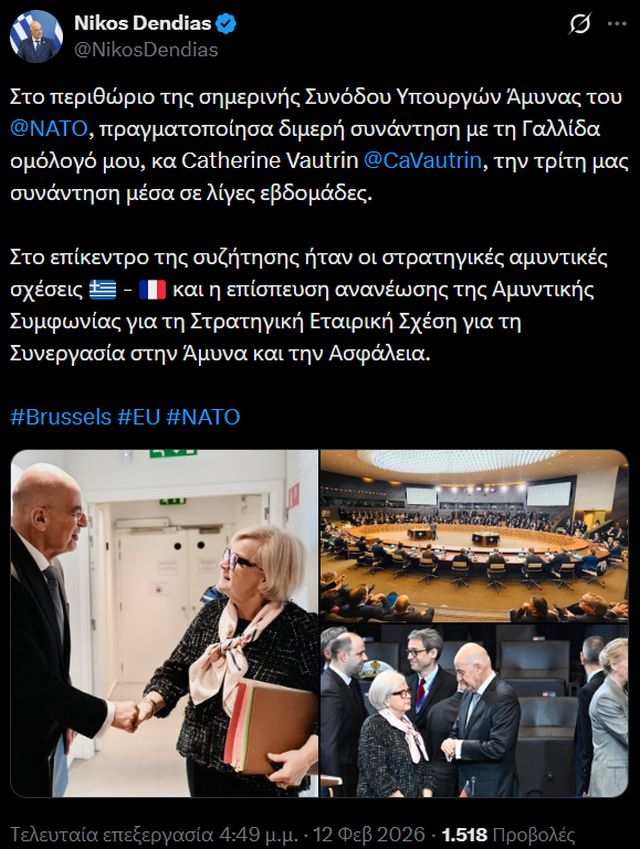 Ο Υπουργός Εθνικής Άμυνας Νίκος Δένδιας συμμετείχε την Πέμπτη 12 Φεβρουαρίου 2026, στη Σύνοδο των Υπουργών Άμυνας του ΝΑΤΟ που διεξήχθη στις Βρυξέλλες.