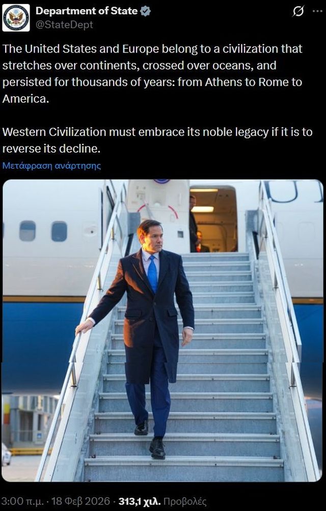 Σύμφωνα με ανάρτηση του αμερικανικού Υπουργείο Εξωτερικών στο «Χ», οι Ηνωμένες Πολιτείες και η Ευρώπη αποτελούν οργανικά μέρη ενός κοινού οικοδομήματος με ρίζες χιλιετιών, το οποίο ξεκινά από την Αθήνα για να φτάσει έως τη σύγχρονη Αμερική.