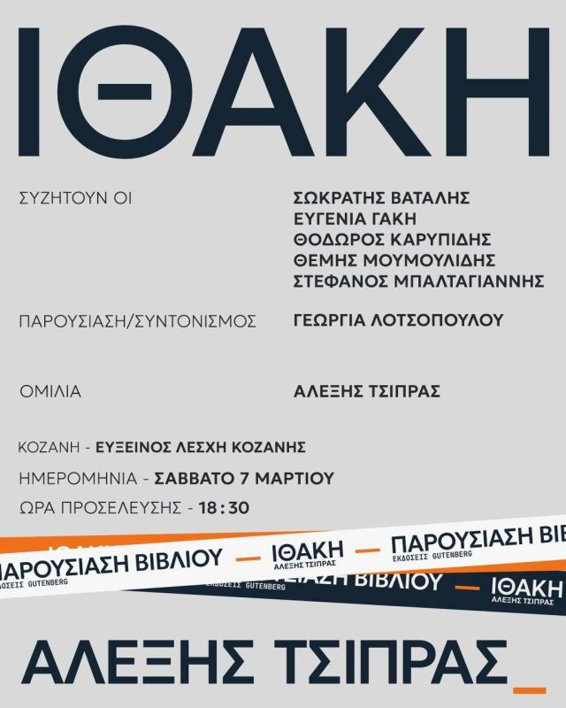 Οι εκδόσεις Gutenberg σας προσκαλούν το Σάββατο 7 Μαρτίου στην παρουσίαση του βιβλίου του Αλέξη Τσίπρα με τίτλο: «ΙΘΑΚΗ»