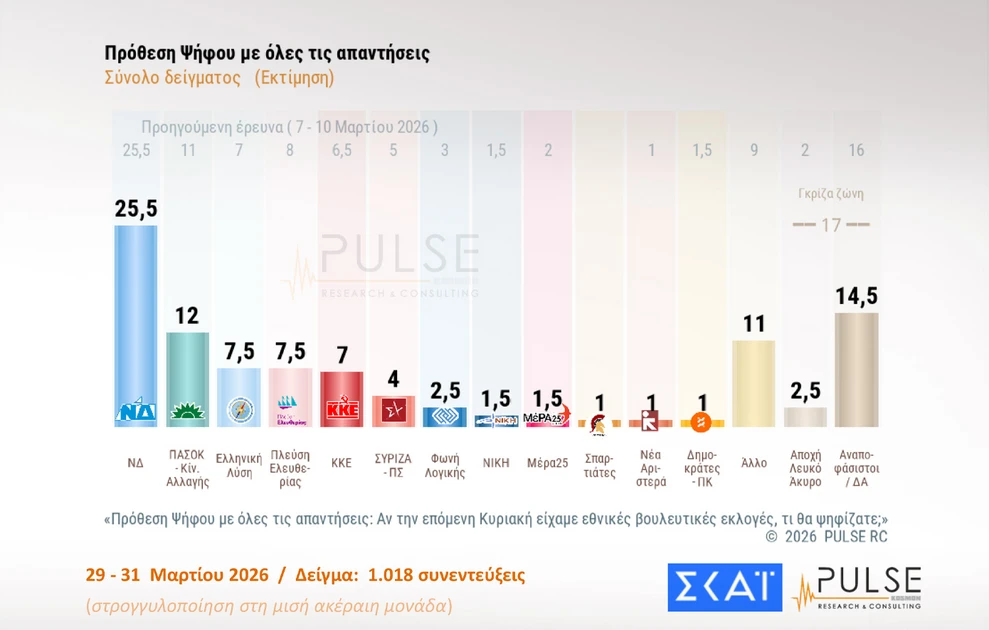Δημοσκόπηση Pulse: Κολλημένη στο 25,5% η ΝΔ – Μόνο 8% κρίνει θετικά τα μέτρα της κυβέρνησης