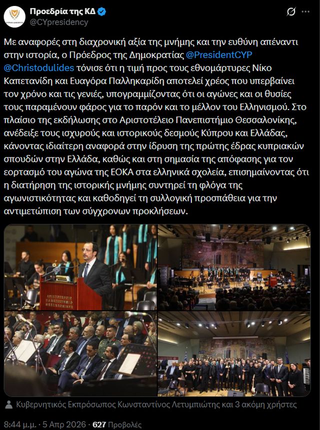 »Τα βιώματα, οι πόθοι και οι αγώνες μας είναι κοινοί», τόνισε ο Πρόεδρος της Κυπριακής Δημοκρατίας Νίκος Χριστοδουλίδης, σε εκδήλωση μνήμης με τίτλο: «Στα βήματα των Ηρώων: Ευαγόρας Παλληκαρίδης – Νίκος Καπετανίδης από την Τραπεζούντα στην Πάφο και στη Θεσσαλονίκη», που πραγματοποιήθηκε το απόγευμα της Κυριακής 05/04 στην Αίθουσα Τελετών του Αριστοτελείου Πανεπιστημίου Θεσσαλονίκης.