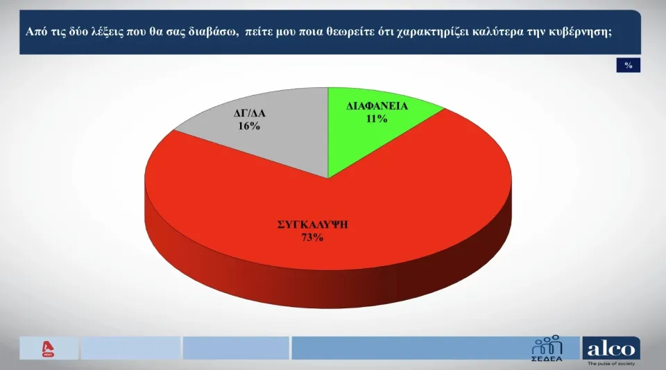 Την ίδια ώρα 8 στους 10 ερωτηθέντες δηλώνουν ότι είναι καθόλου και λίγο ικανοποιημένοι από την κυβέρνηση Μητσοτάκη, ενώ το 73% θεωρεί πως η λέξη «συγκάλυψη» είναι εκείνη που χαρακτηρίζει καλύτερα την κυβέρνηση και μόλις το 11% απαντά η «διαφάνεια».