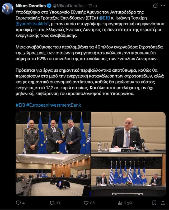 Ο Υπουργός Εθνικής Άμυνας Νίκος Δένδιας υπέγραψε τη Μεγάλη Τετάρτη 8 Απριλίου 2026, με τον Αντιπρόεδρο της Ευρωπαϊκής Τράπεζας Επενδύσεων Ιωάννη Τσακίρη, προγραμματική συμφωνία μεταξύ του ΥΠΕΘΑ και ΕΤΕπ, με αντικείμενο την παροχή τεχνικής βοήθειας και την υλοποίηση έργων ενεργειακής αναβάθμισης σε 40 από τα πλέον ενεργοβόρα στρατόπεδα της χώρας.