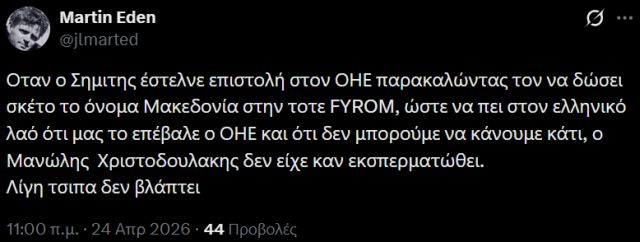 Ιδιαίτερο εθνικό ενδιαφέρον έχει και μία ανάρτηση στο «Χ», η οποία αναφέρει: