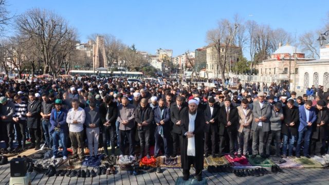 Τούρκοι ισλαμιστές συγκεντρώθηκαν το μεσημέρι της Παρασκευής έξω από την Αγία Σοφία στην Κωνσταντινούπολη ζητώντας να γίνει ξανά τζαμί, από μουσείο που είναι σήμερα.