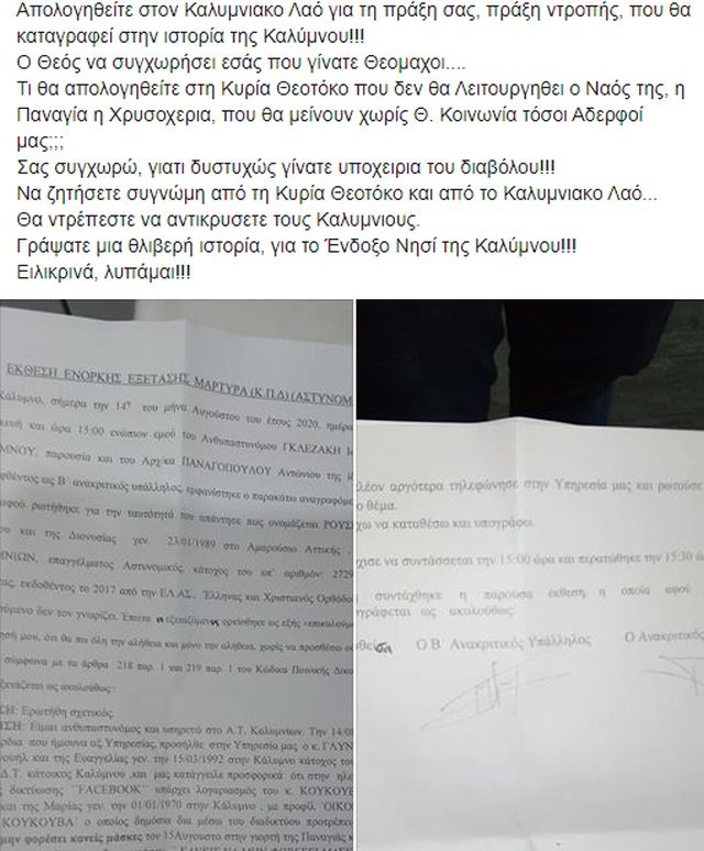 Στη σύλληψη ιερέα, που καλούσε τους πιστούς μέσω Facebook να μην φορέσουν μάσκες τον Δεκαπενταύγουστο, προχώρησε η Αστυνομία στην Κάλυμνο, έπειτα από καταγγελία πολίτη.