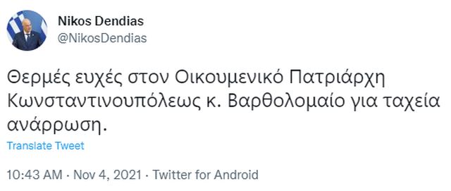Ο υπουργός Εξωτερικών Νίκος Δένδιας εξέφρασε τις θερμές ευχές του στον Οικουμενικό Πατριάρχη για ταχεία ανάρρωση.