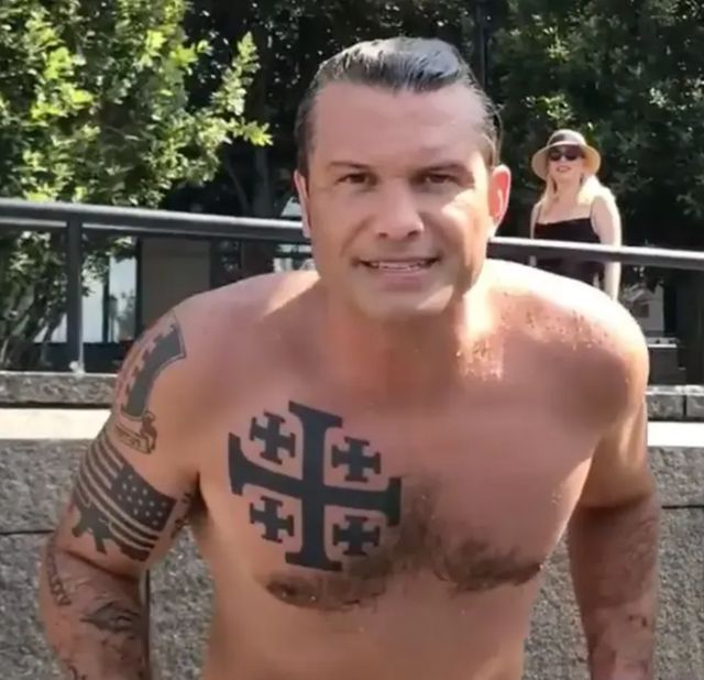 Ο Χέγκσεθ φέρει στο στήθος του ένα τατουάζ με τον Σταυρό των Ιεροσολύμων και στο χέρι του τις λέξεις «Deus Vult», μια πολεμική ιαχή των Σταυροφόρων που σημαίνει «Ο Θεός το θέλει».