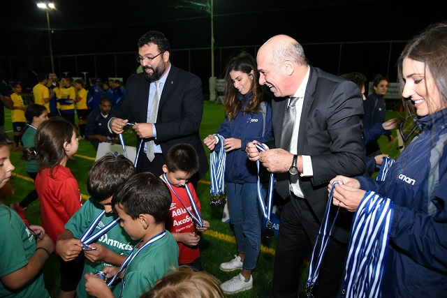 Οι Γιώργος Βασιλειάδης και Σπύρος Φωκάς απονέμουν αναμνηστικά μετάλλια στα παιδιά