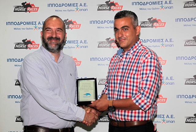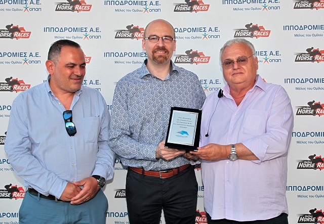 O Chief Technology Officer του ΟΠΑΠ, Michele Fusella και ο Applications Director του ΟΠΑΠ, Στρατής Βαλαβάνης απονέμουν το Τρόπαιο ΚΙΝΟ ΣΤΑ SELF SERVICE TERMINALS στον ιδιοκτήτη του ίππου ΣΠΑΡΤΗ Δημήτρη Παρασκευόπουλο.