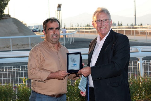 Ο παγκοσμίου φήμης Handicapper και σύμβουλος της Διεθνούς Ομοσπονδίας Ιπποδρομιακών Αρχών Phil Smith απονέμει το Τρόπαιο International Handicapping στον προπονητή της ΣΚΑΪ ΜΠΑΛΛΕΡΙΝΑ Χρήστο Κουβαρά