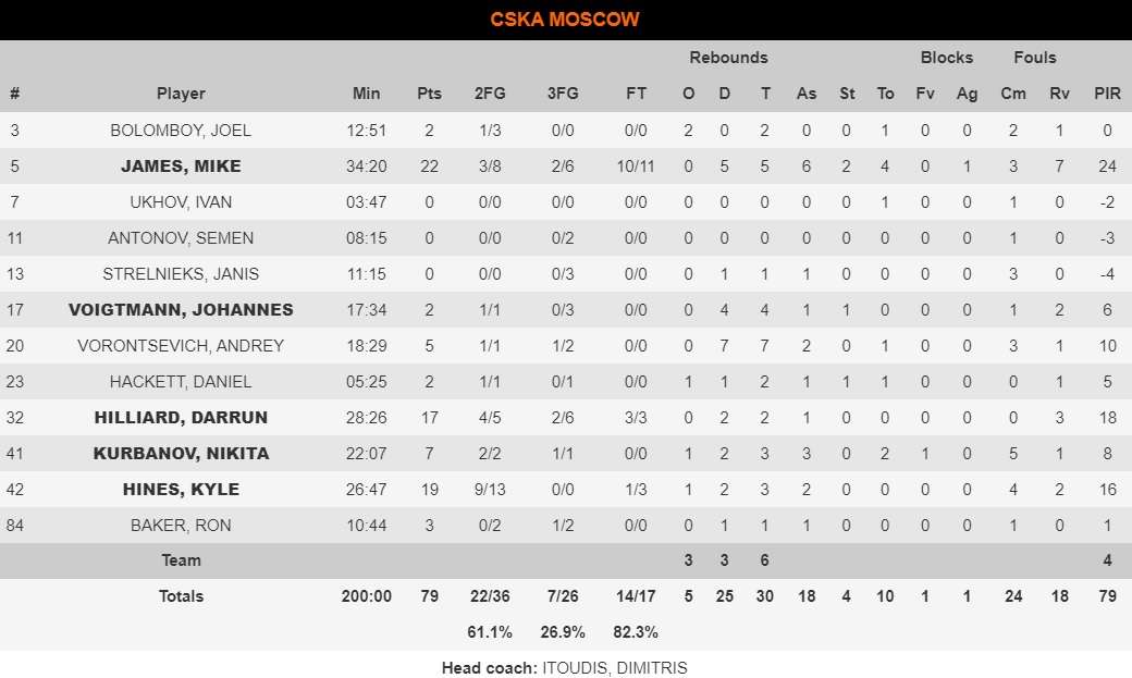 Ο Μάικ Τζέιμς πέτυχε 21 πόντους και μοίρασε και 6 ασίστ, ο Κάιλ Χάινς πρόσθεσε 19 πόντους και 17 ο Νταρούν Χίλιαρντ για τη ρωσική «αρκούδα».