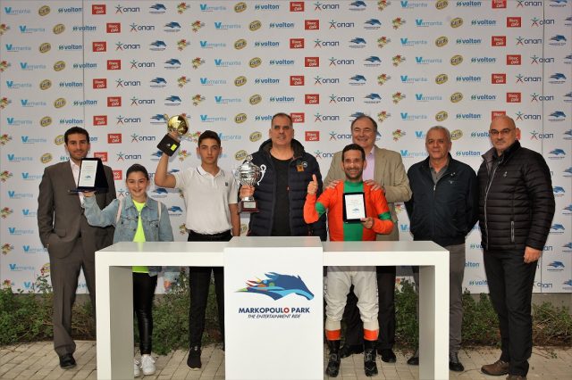 Από αριστερά, ο Project Manager της Ιπποδρομίες Α.Ε., Βύρωνας Κακλόπουλος, τα παιδιά του προπονητή Χρήστου Σταύρου, Χριστιάννα και Άγγελος, ο ιδιοκτήτης Μάριος Κουτσομύτης, ο αναβάτης Μιχάλης Ξυνός, ο Διευθυντής Οικονομικών της Ιπποδρομίες Α.Ε. Γιώργος Σκούρας, ο Αναπληρωτής Γενικός Διευθυντής της ΦΕΕ, Νίκος Αρβανίτης, ο Racing Manager της Ιπποδρομίες Α.Ε., Κώστας Λουκόπουλος.