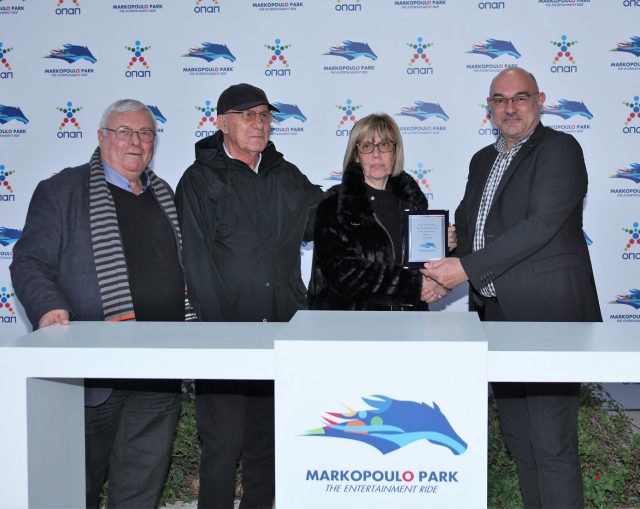 Από αριστερά: Oι ιδιοκτήτες του ΑΤΡΕΪΓΙΟΥ Γιάννης Ντατσόπουλος και Κοσμάς Σκρεπετός με τη σύζυγό του Μαίρη και ο Racing Manager της ΙΠΠΟΔΡΟΜΙΕΣ Α.Ε. Κωνσταντίνος Λουκόπουλος.
