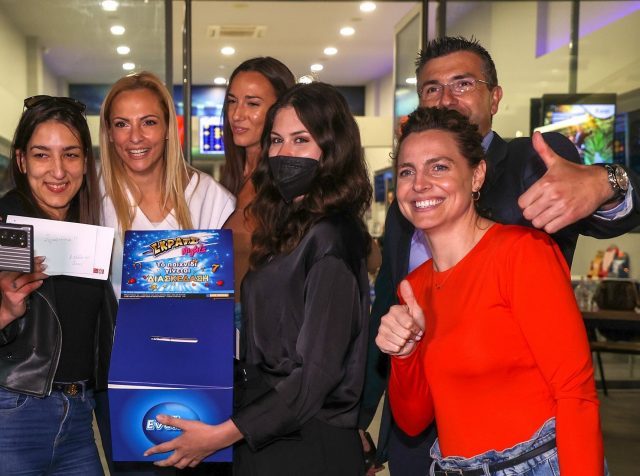 Η νικήτρια της κλήρωσης με την Υβόννη Κτιστάκη, υπεύθυνη του καταστήματος ΟΠΑΠ, και την ομάδα του ΟΠΑΠ.