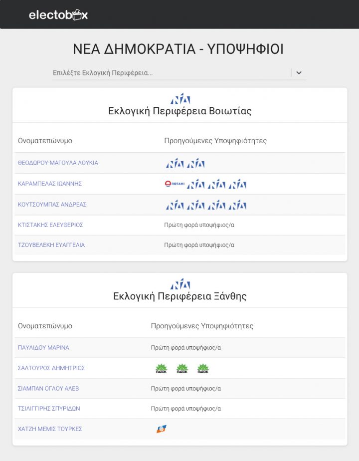 Η ομάδα του electobox.gr, -νέοι επιστήμονες εξειδικευμένοι στην πληροφορική-, κατάφερε να συγκεντρώσει κάθε διαθέσιμη πληροφορία που αφορά τις Εθνικές Εκλογές της τελευταίας δεκαετίας.