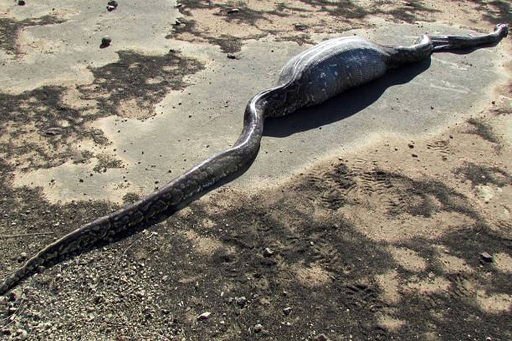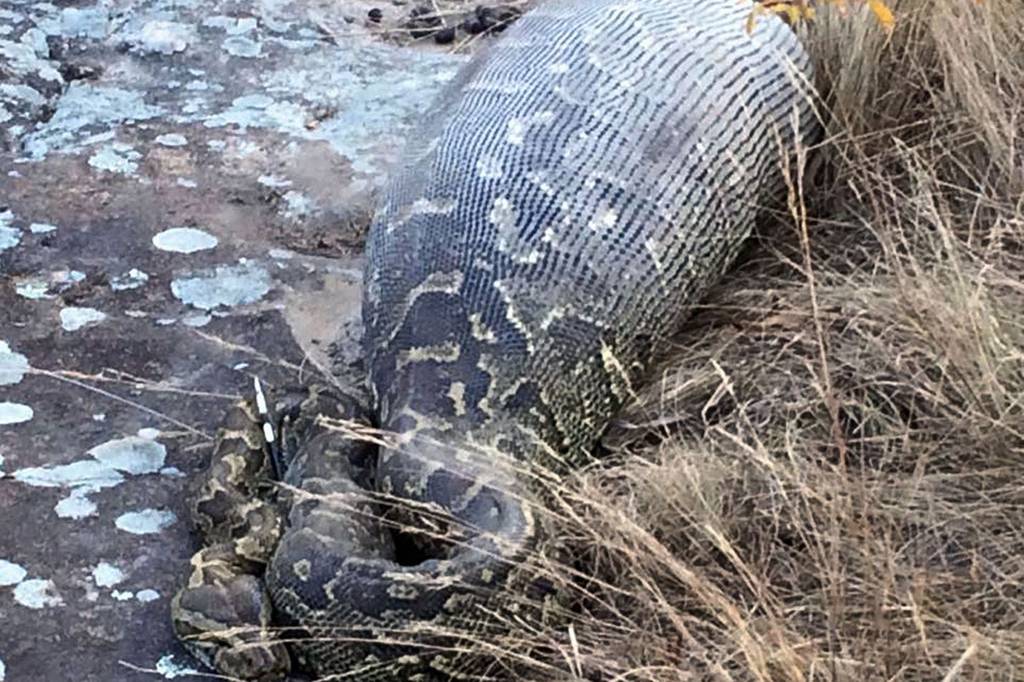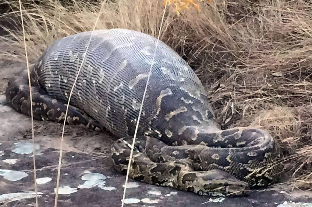 Τις τρομακτικές εικόνες απαθανάτισε ένας ποδηλάτης που εντόπισε το νεκρό πύθωνα, ο οποίος προσπάθησε να χωνέψει το τελευταίο γεύμα του σε μια βραχώδη περιοχή, δίπλα στη λίμνη Eland Game Reserve, κοντά στο Port Shepstone της Νοτίου Αφρικής.