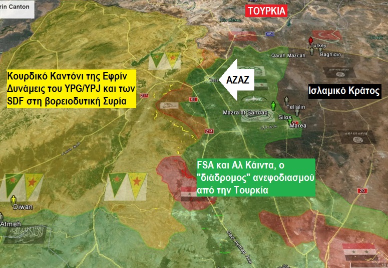 Η στενή βαμμένη πράσινη λωρίδα γης, μεταξύ των Κούρδων (ανατολικά) και του Ισλαμικού Κράτους (δυτικά) είναι ο διάδρομος που έχουν οι τουρκόφιλοι τζιχαντιστές στα βόρεια του Χαλεπιού για να ανεφοδιάζονται από την Τουρκία. Στρατηγικής σημασίας η πόλη Αζάζ κοντά στα σύνορα, αφού από τα συνοριακά περάσματα στην περιοχή της περνάνε τα τουρκικά κονβόι, που βομβαρδίζει τις τελευταίες ημέρες η Ρωσία. Εάν οι Κούρδοι και οι σύμμαχοί τους από τον SDF καταλάβουν την Αζάζ, τότε οι τουρκόφιλοι τζιχαντιστές του FSA και της Αλ Κάιντα δεν θα έχουν από που να ανεφοδιαστούν.