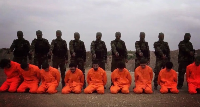 Άνδρες της οργάνωσης Ισλαμικό Μέτωπο οδηγούν αιχμάλωτους από το Ισλαμικό Κράτος σε εκτέλεση, με τρόπο που μιμούνται τα βίντεο της οργάνωσης Ισλαμικό Κράτος.