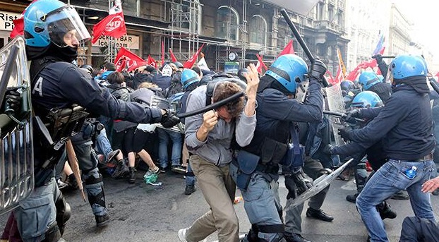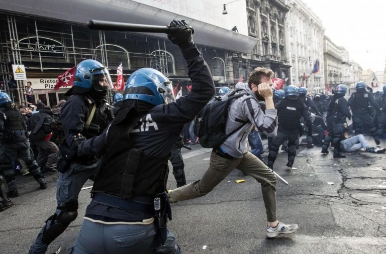 Σύντομα, όμως, οι δρόμοι της Αιώνιας Πόλης βάφτηκαν με αίμα διαδηλωτών: Η περίφημη Βία Βένετο που βρίσκεται κοντά στα υπουργεία Ανάπτυξης και Εργασίας μετατράπηκε σε πεδίο μάχης. Οι αστυνομικοί επιχείρησαν να διασπάσουν τους συγκεντρωμένους κάνοντας εκτεταμένη χρήση δακρυγόνων.