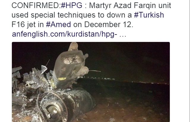 Η ένοπλη πτέρυγα του Εργατικού Κόμματος Κουρδιστάν (PKK), το HPG, ανακοίνωσε την Τετάρτη ότι ομάδα Κούρδων ανταρτών κατέρριψε το τουρκικό F-16 που συνετρίβη τη Δευτέρα κοντά στην τουρκοκρατούμενη κουρδική πόλη του Ντιγιάρμπακιρ (Άμιδα) στη νοτιοανατολική Τουρκία.