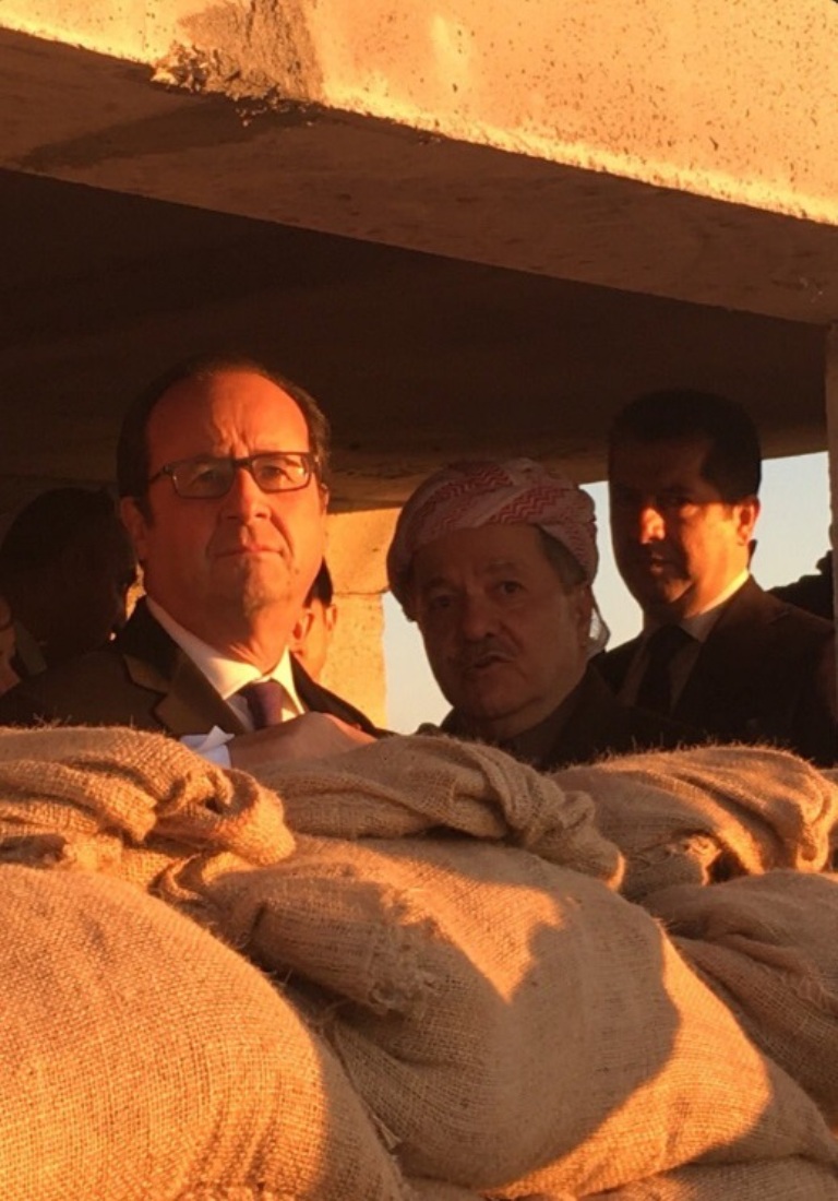 Σε κοινή συνέντευξη Τύπου στην Ερμπίλ με τον Πρόεδρο του ιρακινού Κουρδιστάν, ο Φρανσουά Ολάντ επανέλαβε ότι η Γαλλία θα συνεχίσει να παρέχει στρατιωτική βοήθεια στους Κούρδους του Ιράκ για τον πόλεμο που διεξάγουν ενάντια στο Ισλαμικό Κράτος.