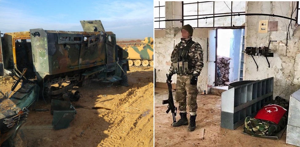 Αριστερά στη φωτογραφία, κατεστραμμένα τουρκικά τεθωρακισμένα στα περίχωρα της Αλ Μπαμπ, δεξιά νεκρός Τούρκος στρατιώτης.